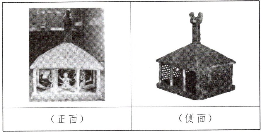 6. 【示例】春秋伎乐铜屋整体方正,顶部状似一只小鸟,似乎在“向天而鸣”。中间通过一根立柱相连,底部是一座方正的房屋,屋顶由60四块斜坡拼接而成。正面没有墙和门,仅立着两根柱子,其余三面有墙,呈镂空格子状。伎乐铜屋中的奏乐人坐姿端庄,静静地观察它们,似乎还可隐隐闻得笙歌之声。