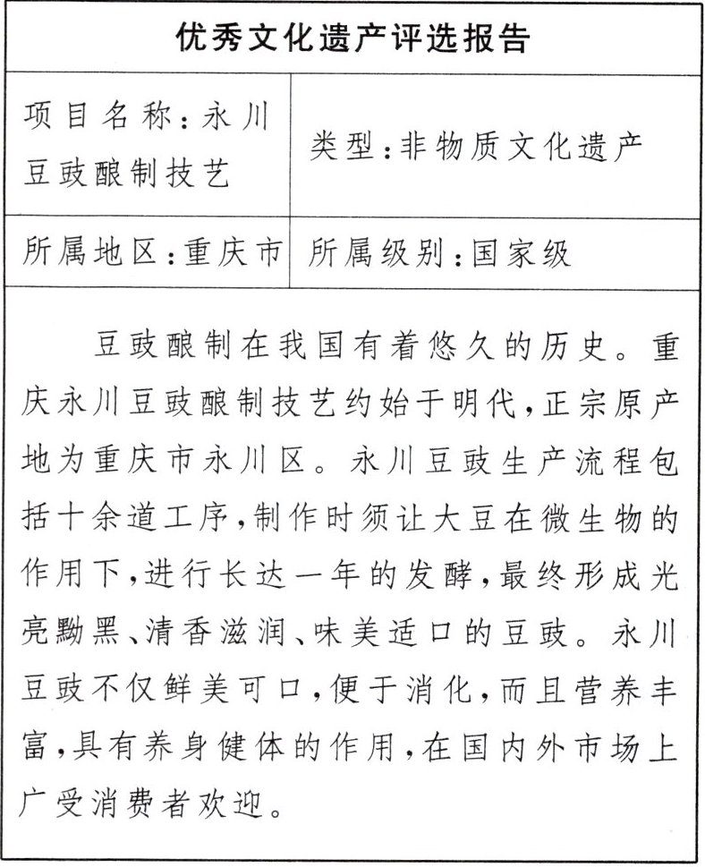 3. 你们组评选出的“优秀文化遗产”候选项目是“永川豆豉酿制技艺”,请你结合报告内容,向评委们现场推荐“永川豆豉酿制技艺”。