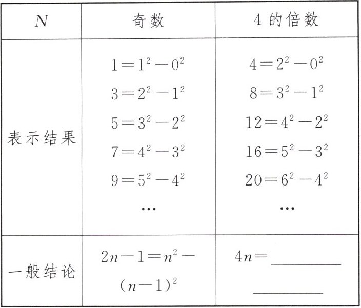 15. 新考向 阅读理解 (2024·安徽)数学兴趣小组开展探究活动,研究了“正整数 $ N $ 能否表示为 $ x^2 - y^2 $($ x,y $均为自然数)”的问题.