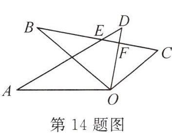 14. 如图,$\triangle AOD \cong \triangle BOC$,$\angle COD = 40^{\circ}$,$AD$与$BC$相交于点$E$,$OD$与$BC$相交于点$F$,则$\angle DEC$的度数为