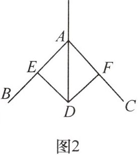 9. 新考向 真实情境 图1是一乐谱架,利用立杆可进行高度调节,图2是其底座部分的平面图,其中支撑杆AB=AC,点E,F分别为AB,AC的中点,ED,FD是连接立杆和支撑杆的支架,且ED=FD. 立杆在伸缩过程中,总有△AED≌△AFD,其判定依据是(