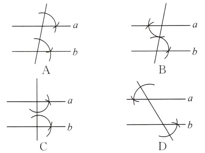 5. 下列尺规作图中,不一定能判定直线$a$平行于直线$b$的是(