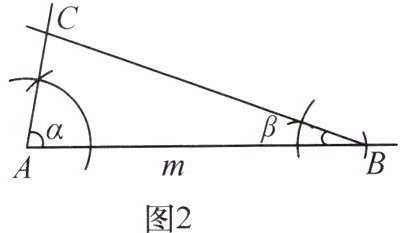 作法:如图2,①作线段$AB = m$;②在$AB$的同旁作$\angle A=\angle \alpha$,$\angle B=\angle \beta$,$\angle A$与$\angle B$的另一边交于点$C$,则$\triangle ABC$就是所求作的三角形.这样作图的依据是(