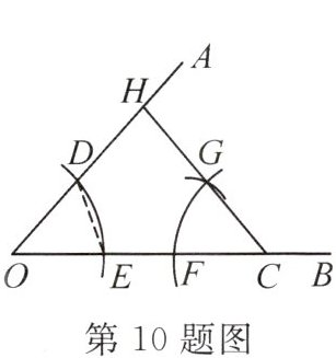 10. 如图,已知$\angle AOB=\alpha$,点$C$为射线$OB$上一点,用尺规按如下步骤作图:①以点$O$为圆心,任意长为半径作弧,交$OA$于点$D$,交$OB$于点$E$;②以点$C$为圆心,$OD$的长为半径作弧,交$OC$于点$F$;③以点$F$为圆心,$DE$的长为半径作弧,交前面的弧于点$G$;④连接$CG$并延长交$OA$于点$H$,则$\angle AHC=$