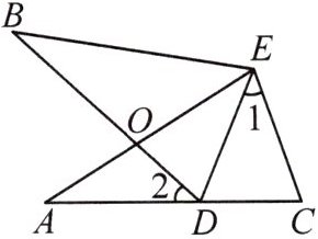 8. (2023·淮南大通区期末)如图,$\angle A = \angle B$,$AE = BE$,点$D$在边$AC$上,$\angle 1 = \angle 2$,$AE$和$BD$相交于点$O$。求证:$\triangle AEC≌\triangle BED$。