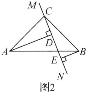 (2)当直线MN处在图2的位置时,直接写出DE,AD,BE之间的数量关系。