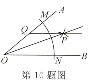 10. 如图,已知∠AOB=40°,以点O为圆心,以适当长度为半径画弧,分别交OA,OB于点M,N,再分别以点M,N为圆心,大于$\frac{1}{2}MN$的长为半径画弧,两弧交于点P,作射线OP,过点P作PQ//OB交OA于点Q,则∠OPQ的度数是