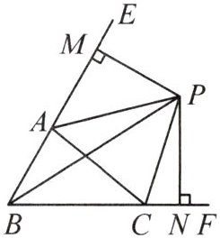15. 如图,在$\triangle ABC$中,$\angle ABC$,$\angle EAC$的平分线$BP$,$AP$交于点$P$,延长$BA$,$BC$,$PM \perp BE$,$PN \perp BF$,垂足分别为$M$,$N$,则下列结论: