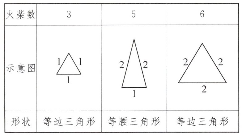 (2)8根火柴能搭成1种三角形(3,3,2),如图所示: