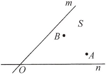 8. 如图,电信部门要在区域 $ S $ 内修建一座信号发射塔,按照设计要求,发射塔到两个城镇 $ A $,$ B $ 的距离必须相等,到两条高速公路 $ m $,$ n $ 的距离也必须相等,则发射塔应修建在什么位置?在图上标出它的位置.(要求:尺规作图,保留作图痕迹,不写作法)