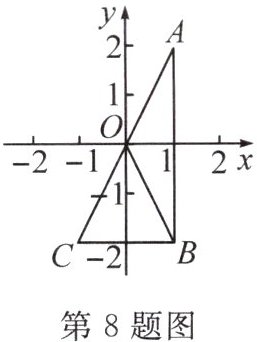 8. (教材 P75 练习 T2 变式)如图, $ x $ 轴是 $ \triangle AOB $ 的对称轴, $ y $ 轴是 $ \triangle BOC $ 的对称轴,点 $ A $ 的坐标为 $ (1,2) $,则点 $ C $ 的坐标为