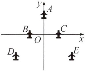 9. 如图,这是战机在空中展示的轴对称队形.以飞机 $ B $, $ C $ 所在直线为 $ x $ 轴、队形的对称轴为 $ y $ 轴,建立平面直角坐标系.若飞机 $ E $ 的坐标为 $ (40,a) $,则飞机 $ D $ 的坐标为(