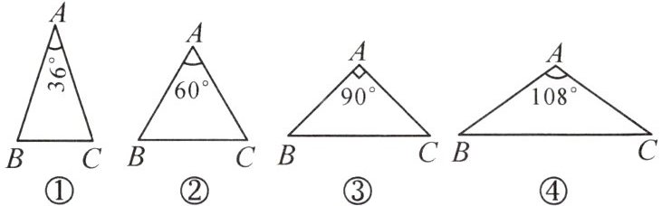 12. 如图,下列4个三角形中,均有AB=AC,则经过三角形的一个顶点的一条直线能够将这个三角形分成两个小等腰三角形的是(