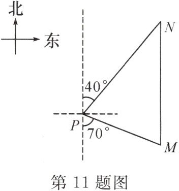 11. 北京五中校本经典题 如图,一艘海轮位于灯塔P的南偏东70°方向的点M处,它以40海里/时的速度向正北方向航行,2小时后到达位于灯塔P的北偏东40°的点N处,则点N处与灯塔P的距离为(