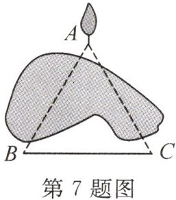 7. 如图,在一个池塘两旁有一条笔直的小路($B$,$C$为小路的两端点)和一棵小树($A$为小树位置),测得$\angle ABC = 60^{\circ}$,$\angle ACB = 60^{\circ}$,$BC = 50\mathrm{m}$,则$AB =$