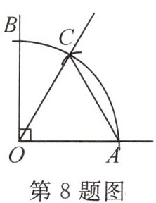 8. 如图,以直角顶点$O$为圆心,适当长为半径画一条弧,分别交直角两边于$A$,$B$两点.若再以点$A$为圆心,$OA$的长为半径画弧,与前弧交于点$C$,则$\angle BOC =$