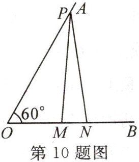 10. 如图所示,已知∠AOB=60°,点P在边OA上,OP=12,点M,N在边OB上,PM=PN.若MN=2,则OM=