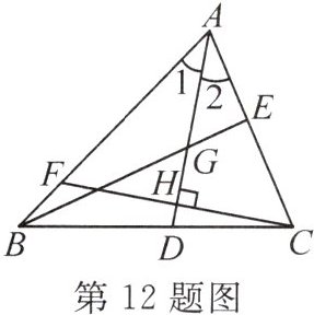 12. 如图,在△ABC 中,∠1 = ∠2,G 为 AD 的中点,连接 BG 并延长,交 AC 于点 E,过点 C 作 CH ⊥ AD 于点 H,延长 CH 交 AB 于点 F. 下列说法错误的是(