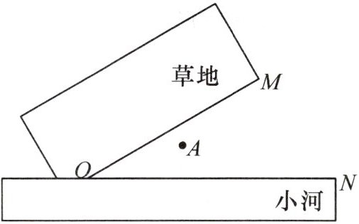 4. 如图,草地边缘 $ OM $ 与小河河岸 $ ON $ 在点 $ O $ 处形成 $ 30^{\circ} $ 的夹角,牧马人从 $ A $ 地出发,先牵着马到草地吃草,然后再去河边饮水,最后回到 $ A $ 地. 已知 $ OA = 2\ km $,请在图中设计一条路线,使所走的路程最短,并求出整个过程所行走的路程.
