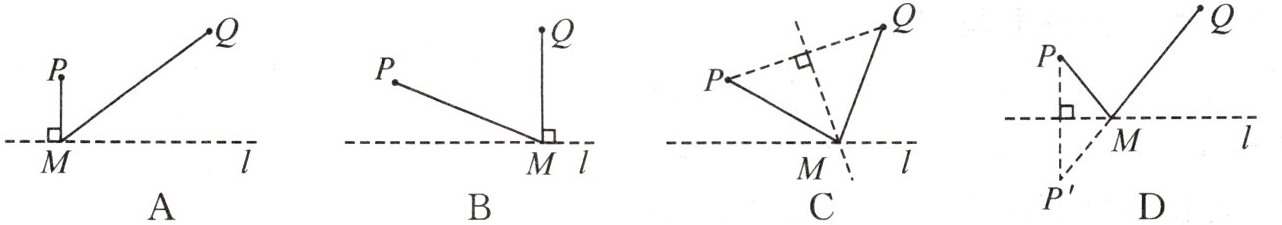 1. 如图,直线 $ l $ 是一条河,$ P $,$ Q $ 是两个村庄. 计划在 $ l $ 上的某处修建一个水泵站 $ M $,向 $ P $,$ Q $ 两地供水. 现有如下四种铺设方案(图中实线表示铺设的管道),则所需管道最短的是()