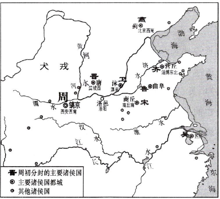 6. (跨学科 地理)西周初年的整体战略是稳定西北、开发东南。在东进过程中,齐、鲁是前哨,卫国接济东进主力,也北瞰燕冀,东控徐淮(如图所示)。这反映出西周统治者(