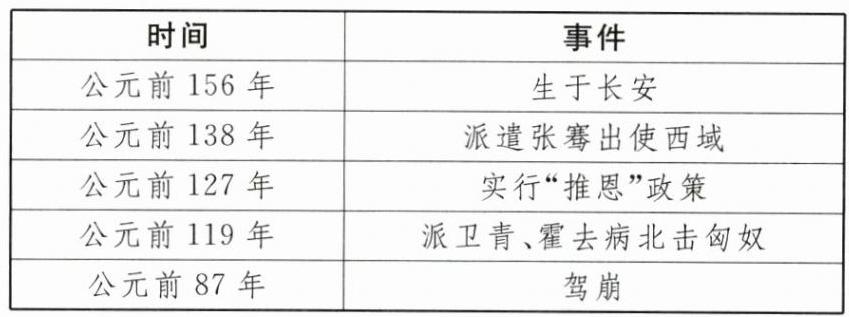 材料:公元前 156 年(汉景帝元年),刘彻生于长安汉皇宫猗兰殿。公元前 141 年(景帝后元三年),景帝驾崩,刘彻即位,时年十六岁。刘彻 19 岁时,张骞应募首次出使西域。公元前 127 年(武帝元朔二年),汉武帝实行“推恩”政策:“诸侯王除以嫡长子继承王位外,或欲推私恩分子弟邑者,令各条上”,由皇帝制定其封号。武帝元狩四年,时年 38 岁,汉武帝派大将卫青、霍去病率精骑出击匈奴,发起漠北战役。公元前 112 年(武帝元鼎五年),45 岁时,汉武帝因列侯献酎金轻色恶,夺爵者 106 人。公元前 87 年(武帝后元二年),汉武帝驾崩,终年七十岁。