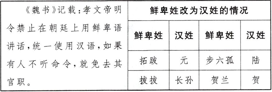 (1)改革:北魏孝文帝改革。(2分)主要措施:①规定官员上朝必须使用汉语;②改鲜卑姓为汉姓。(每点1分,共2分)