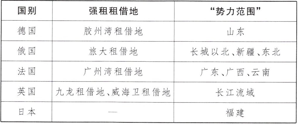 材料二:列强在华强租租借地和划分“势力范围”情况表。