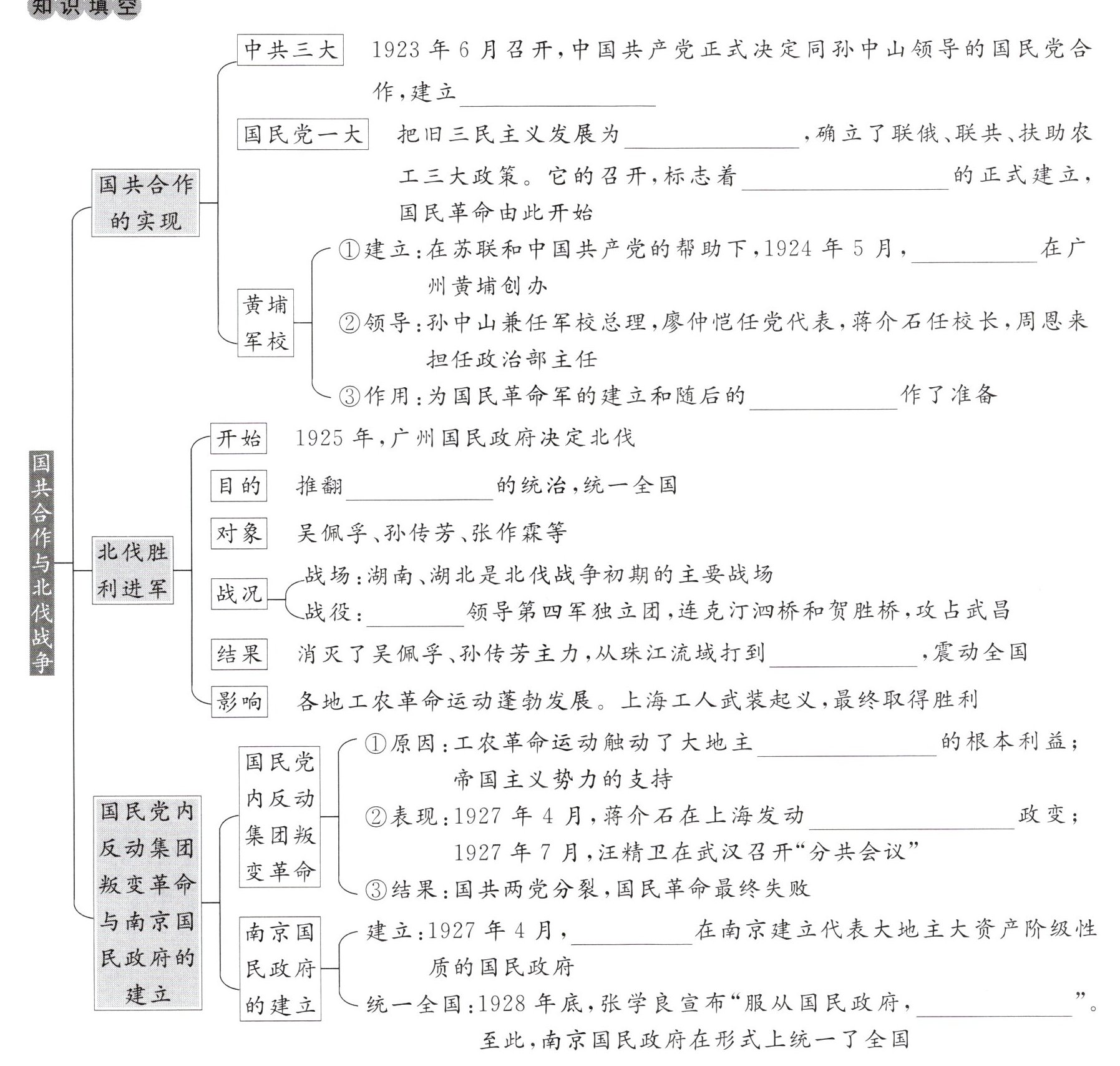 革命统一战线 新三民主义 国共两党合作 孙中山 北伐战争 北洋军阀 叶挺 长江流域 大资产阶级 四一二反革命 蒋介石 改易旗帜