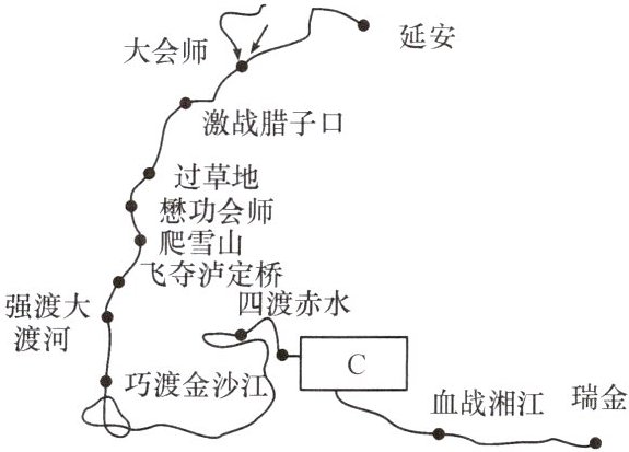 (2) 根据材料二并结合所学知识,指出红军长征结束的地点。其中C处发生的事件有何历史意义?(5分)