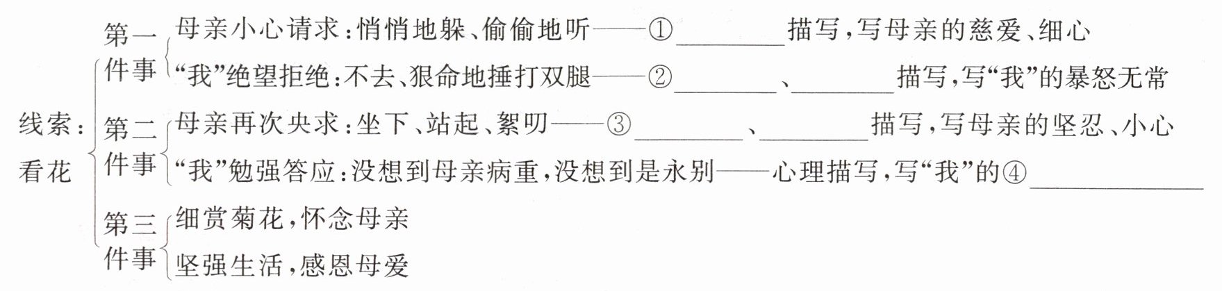 描写,写母亲的坚忍、小心“我”勉强答应:没想到母亲病重,没想到是永别——心理描写,写“我”的④