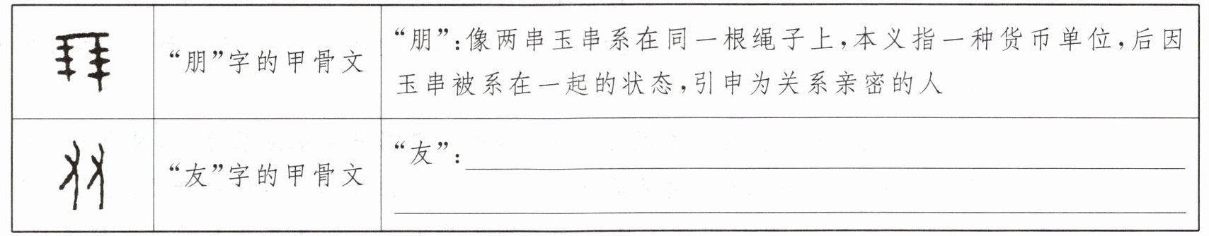 2. 小文查找了"朋友"二字的甲骨文,请你仿照表格中"朋"字的字源解说,对"友"字做字源解说。