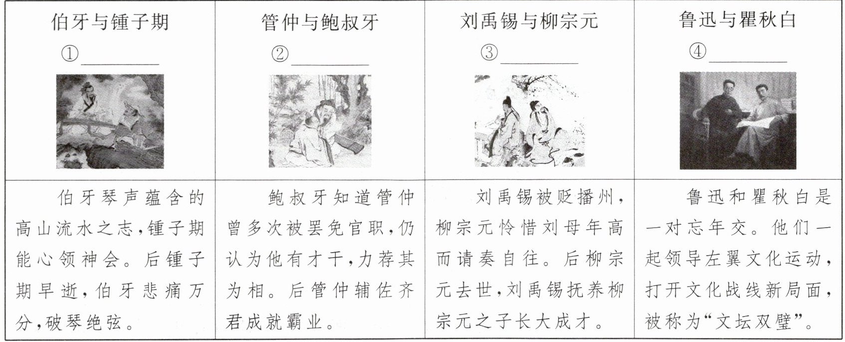 3. 小华搜集了下面的图片和故事,请你根据内容,选择恰当的主题词填入横线处,从而感受交友之道。