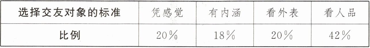 9.【示例】近半数中学生交友时看重对方人品。(或中学生交友时看对方是否有内涵的人数占比最少。)