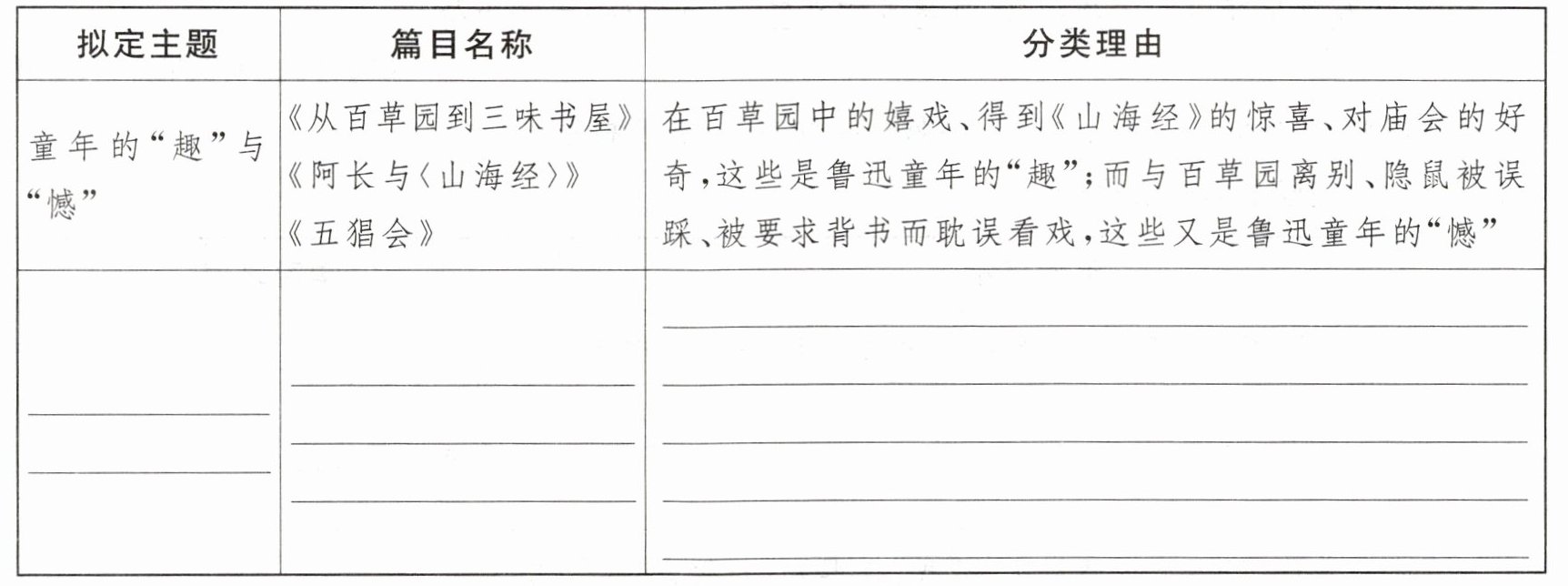 3. 文学社将开展“《朝花夕拾》主题阅读”分享会,请你按照示例,重新拟定一个主题,选出相应篇目(不少于三个),阐述分类理由。