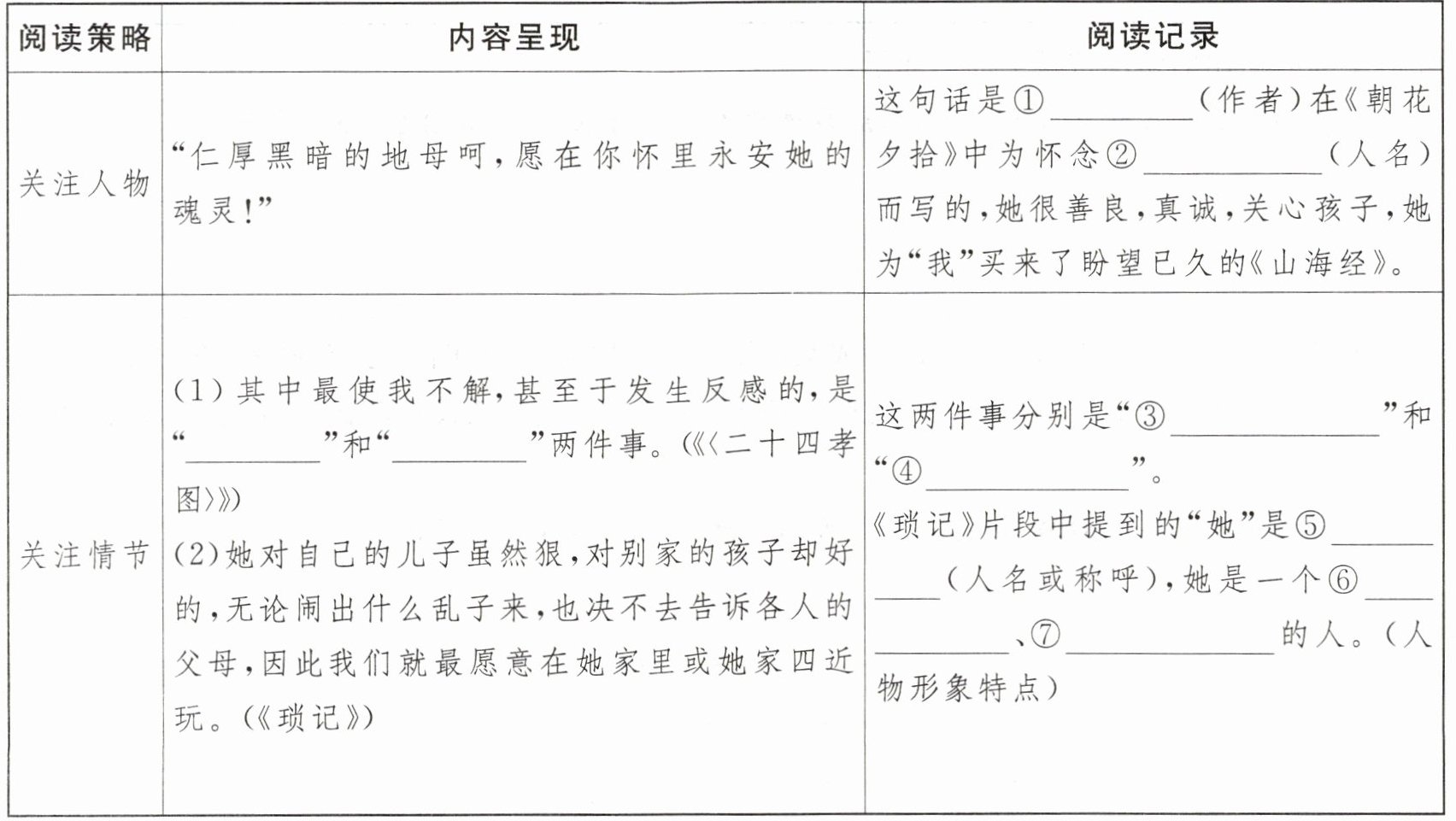 4.①鲁迅 ②长妈妈 ③老莱娱亲 ④郭巨埋儿 ⑤衍太太 ⑥阴险虚伪 ⑦自私自利
