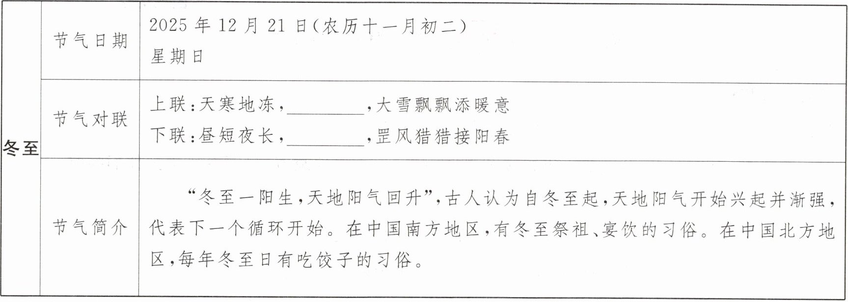 【展望·希冀之帆】2025 年 12 月 21 日是二十四节气之一——冬至,请你阅读下面表格相关信息,并完成任务。