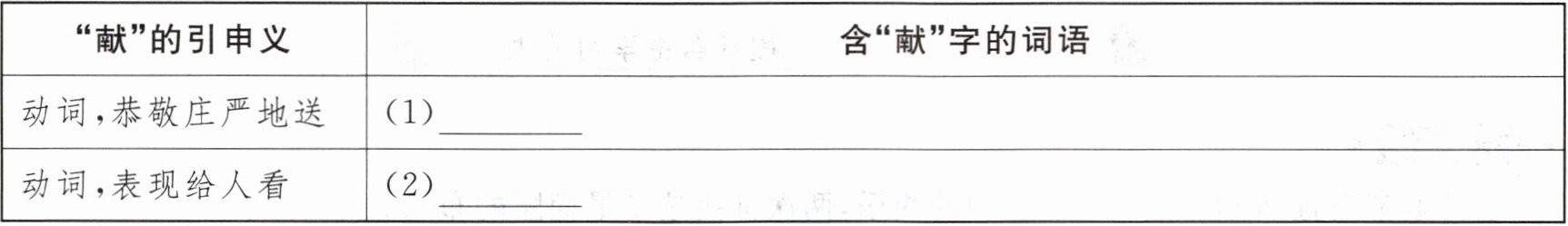 。3. 下面是小黄和小楚整理的关于“献”字的资料卡片,请你在(1)(2)处分别补充一个含“献”字的词语。