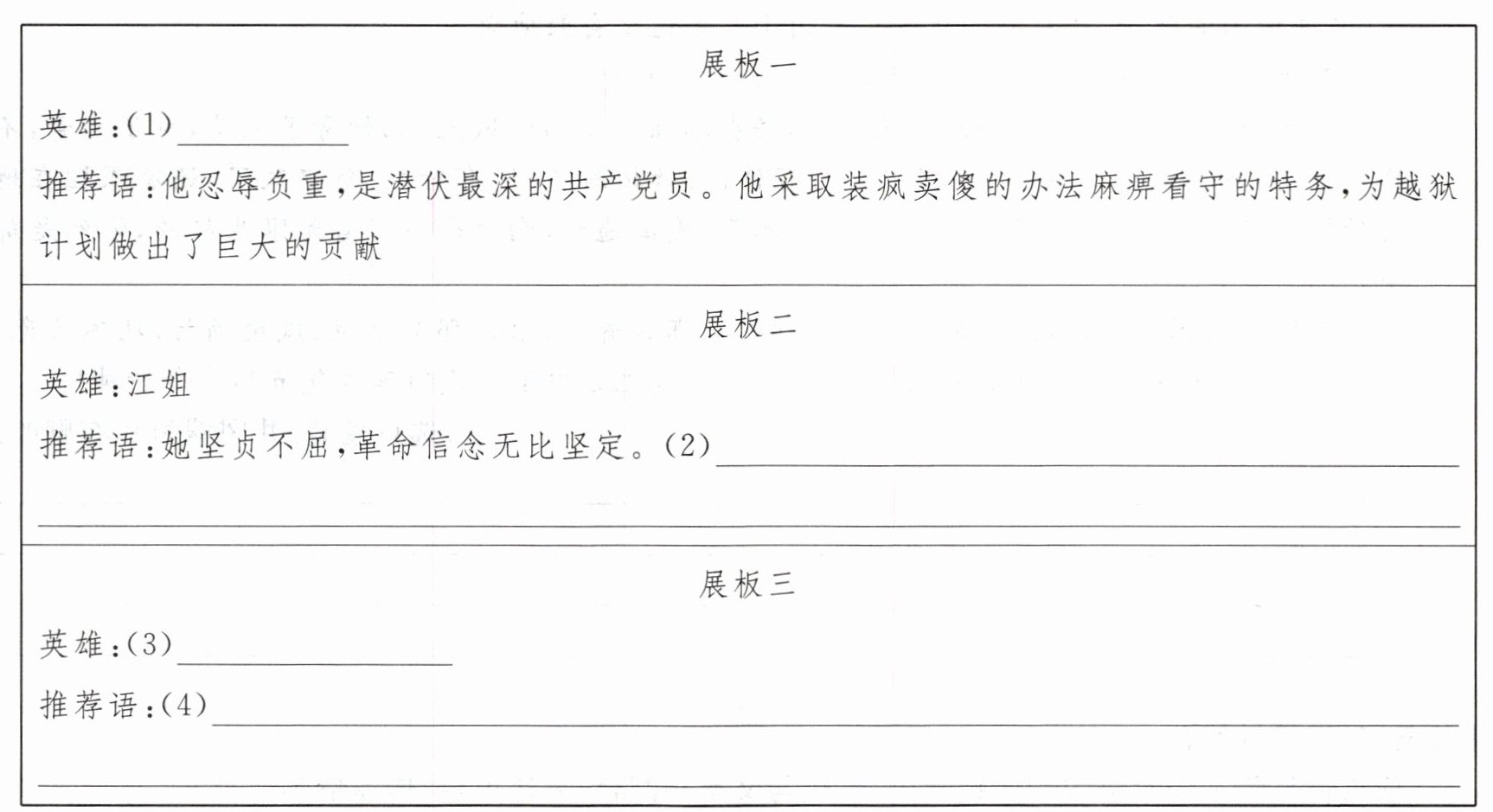 2. 《红岩》是一部用烈士鲜血写成的英雄史诗,书中塑造了众多革命战士的英雄群像,请你为“红岩馆”补充完善以下三块展板的内容。
