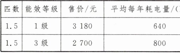 (2)购买1级能效的空调更划算.理由如下:购买1级能效的空调使用10年的综合费用为3180+0.6×640×10=7020(元);购买3级能效的空调使用10年的综合费用为2700+0.6×800×10=7500(元).