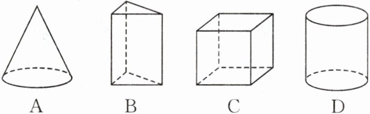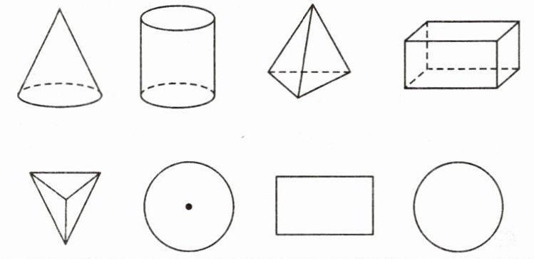 圆锥-带圆心的圆,圆柱-圆,三棱锥-三角形,长方体-长方形(注:实际答题时应按题目给定的图形序号对应连接,此处根据常见题型描述)