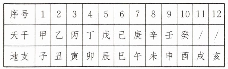 5. A|兰生复旦校本经典题干支纪年法是中国历法上自古以来就一直使用的纪年方法,干支是天干和地支的总称.干支纪年法的组合方式是天干在前,地支在后,以十天干和十二地支循环配合,每个组合代表一年,60年为一个循环.我们把天干、地支按顺序排列,且给它们编上序号.天干的计算方法:年份减3,再除以10所得的余数;地支的计算方法:年份减3,再除以12所得的余数.以2022年为例:$(2022-3)÷10=201\cdots\cdots9,(2022-3)÷12=168\cdots\cdots3$,故天干为9,地支为3,对照天干地支表得出,2022年为农历壬寅年.
