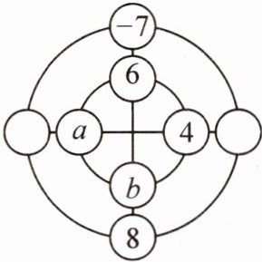 4. (人教7上P58“数学活动2”变式)(2024·深圳南山区期中)爱动脑筋的小栩同学设计了一种“幻圆”游戏,将$-1,-2,-3,7,4,6,-7,8$分别填入图中的圆圈内,使横、竖以及内外两圈上的4个数字之和都相等,他已经将4,6,$-7$,8这四个数填入了圆圈,则图中$a+b$的值为