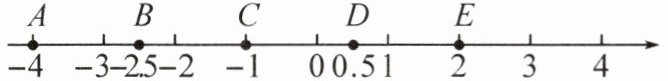 点A表示-4,点B表示-2.5,点C表示-1,点D表示0.5,点E表示2。