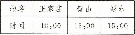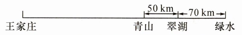 解:设王家庄距翠湖的路程为x km,则王家庄距青山的路程为(x-50)km,王家庄距绿水的路程为(x+70)km.根据题意,得$\frac{x-50}{3}=\frac{x+70}{5}$,解得x=230.答:王家庄距翠湖的路程为230 km.