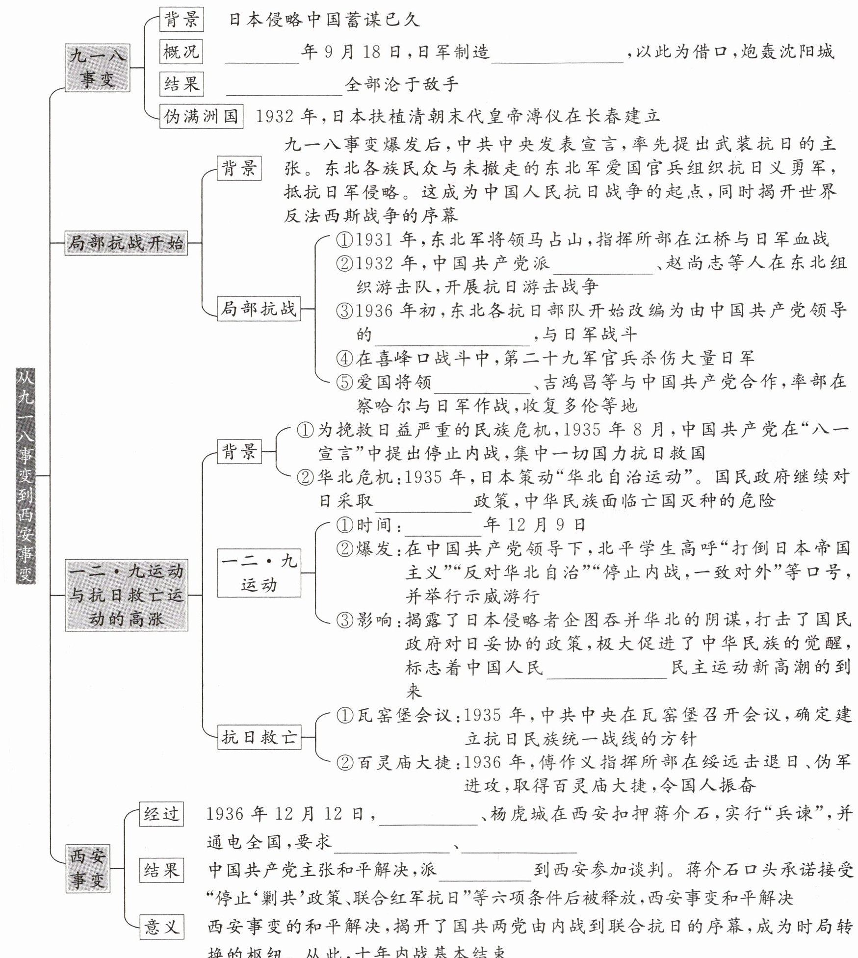 1931 柳条湖事件 东北三省 杨靖宇 东北抗日联军 冯玉祥 不抵抗 1935 抗日救亡 张学良 停止内战 一致抗日 周恩来