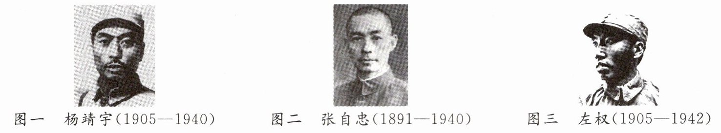 (1)杨靖宇:1940年,杨靖宇在与日寇周旋几昼夜后,孤身一人,弹尽粮绝,最后壮烈牺牲。(1分)张自忠:1941年枣宜会战中,集团军总司令张自忠为国牺牲,是当之无愧的军人楷模。(1分)左权:抗日战争爆发后,左权协助指挥八路军开赴华北抗日前线,在突围转移过程中,不幸牺牲。(1分)