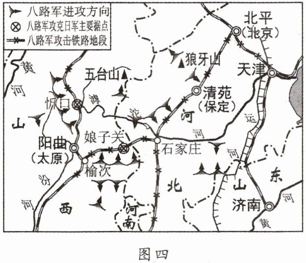 (2) 任务二:读图学史篇。争取抗战胜利的过程中,中国人民在敌后战场进行了艰苦卓绝的斗争。请你为图四地图命名。(2分)