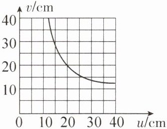 首先,分析图像。当物距$u$等于像距$v$时,都等于二倍焦距,此时成倒立、等大的实像。从图中可以看出,当$u=v=20cm$时,满足这一条件,所以$2f=20cm$,解得$f=10cm$。