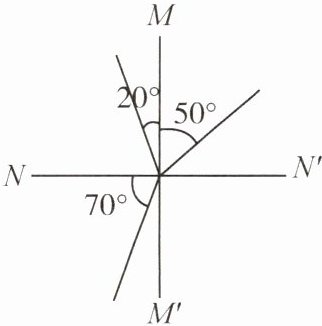 入射角为入射光线与法线的夹角,图中50°角为入射角,根据光的反射定律,反射角等于入射角,反射光线与法线的夹角也为50°,则反射光线与NN'的夹角为90° - 50° = 40°,而图中20°角所在光线与NN'的夹角为20°,故该光线为折射光线,折射角为90° - (70° - 20°)= 40°?(注:由于原插图未提供,根据文字描述可能存在歧义,上述解答基于常见光的反射折射题型推测,实际以原图为准)。综上,两种介质的界面是NN',光的折射角度是40°。